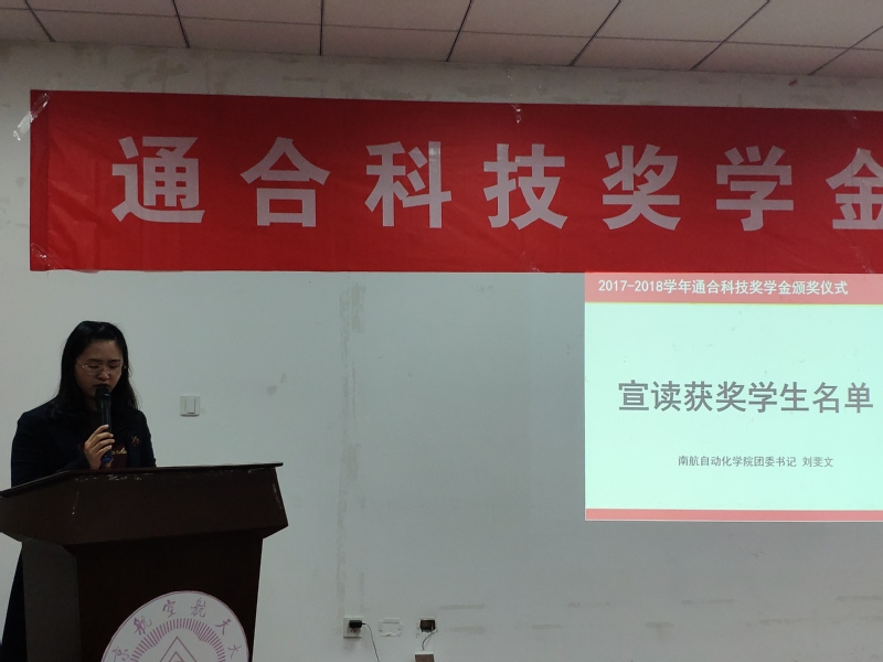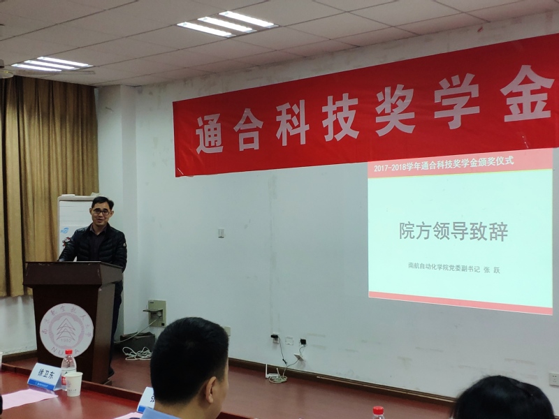2019年3月21日下午,2017-2018学年通合科技奖学金颁奖仪式于南航将军路校区东区大学生发展中心414会议室举办,出席仪式的有石家庄通合电子科技股份有限公司技术总工徐卫东、招聘主管种晨光、beat365中国官方网站党委副书记张跃、电气工程系教授黄文新、院团委书记刘斐文,颁奖仪式由研究生辅导员汤呈懿主持。