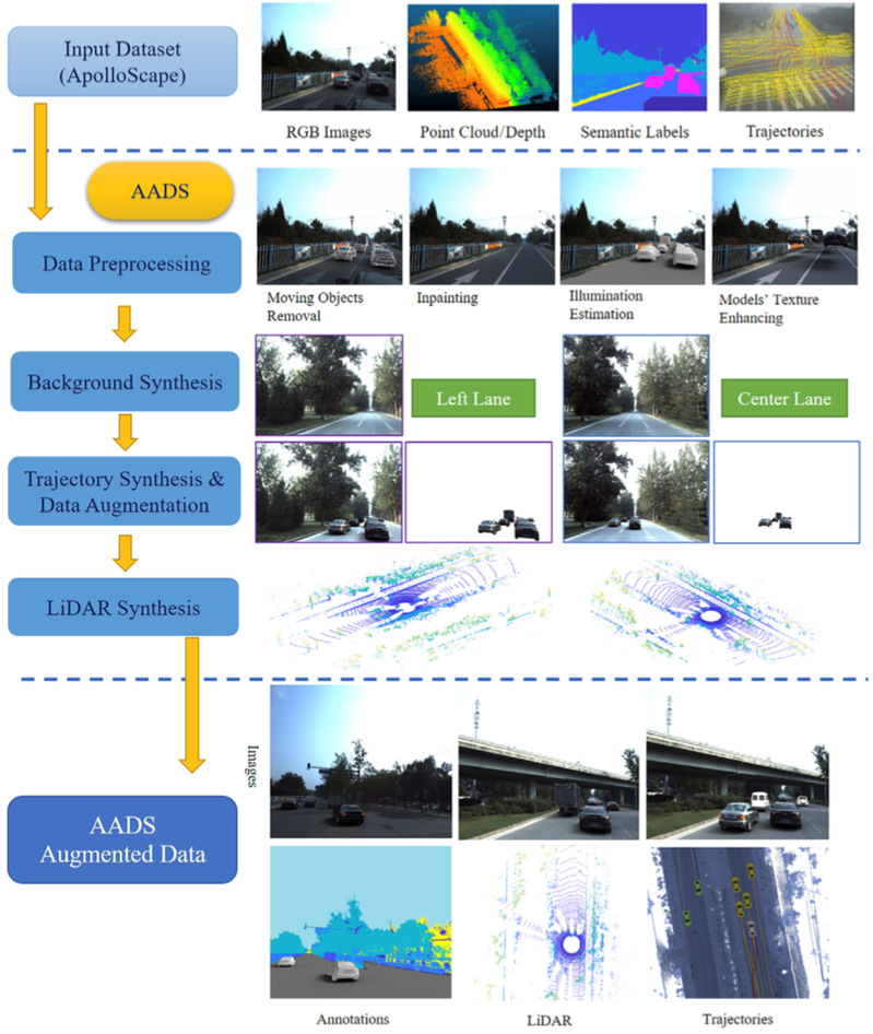 AADS 系统的输入、处理流程和输出。上:真实采集的数据集输入。虚线之间显示了 AADS 仿真系统的主要处理流程,包含数据预处理、虚拟背景合成、轨迹合成、移动目标的增强和 LiDAR 模拟。下:AADS 系统的输出,包含合成的 RGB 图像、LiDAR 点云和带有标注信息的车辆行驶轨迹。