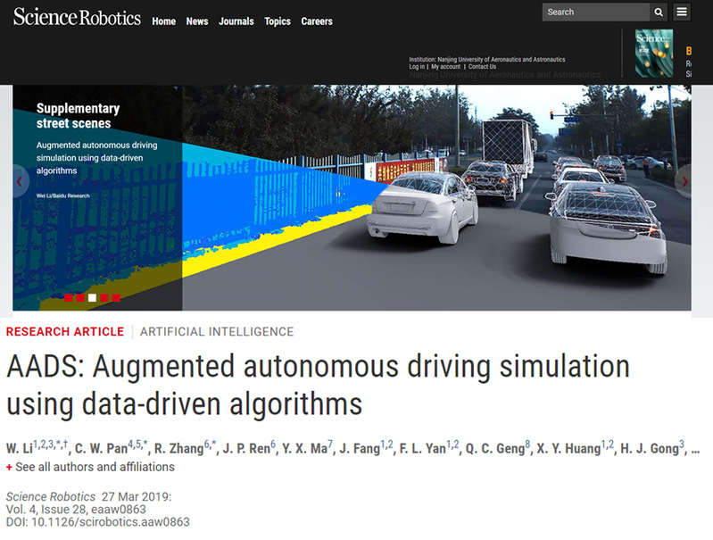 我院龚华军教授指导的博士生李伟同学,以第一作者和共同通讯作者身份发表的学术论文“AADS: Augmented Autonomous Driving Simulation Using Data-Driven Algorithms”,于2019327日刊登在《科学》杂志子刊《科学·机器人学》(Science·Robotics,该刊编辑在杂志主页对论文进行了推荐。该研究成果介绍了一种增强现实的自动驾驶仿真系统,它可自动创建逼真的道路场景,为自动驾驶车辆提供更为可靠且廉价的实验室模拟方法,可大规模用于训练和测试评估自动驾驶系统的路径规划和决策算法。《科学·机器人学》旨在传播机器人与人工智能相关领域的代表性研究成果,平均每期刊出不多于4篇的研究类文章。
