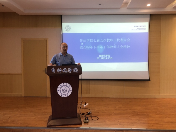 院长江驹同志代表学院做工作报告,报告从党建、教学、科研、人事工作、学科建设和学术交流、学生工作、工会与安全保卫工作等七个方面全面对学院2019年上半年的工作进行总结,对2019年下半年工作进行了全面部署。江院长表示,在全院师生的共同努力下,学院多方面取得了新的突破和发展,如新增国家优秀青年基金获得者 1名、新增省级优秀毕业设计论文3篇、“领航工程”获江苏省高校“最佳党日活动”、电气工程及其自动化顺利通过江苏省高校品牌专业建设工程一期项目期末验收,并获得优秀等。这些成绩的取得为学院下一阶段的快速发展奠定了良好的基础。江院长指出,学院要顶层规划持续推进学院综合改革、做好“双一流”学科建设、做好第五轮教学评估的准备工作、继续加强高水平师资队伍引培、做好本科生教学、人才培养工作、提升研究生生源、教学质量,积极争取国家级重大和重要项目,以更加突出的业绩,为实现“航空航天特色鲜明的高水平、国际化、研究型世界一流学院”建设目标做出应有的贡献!