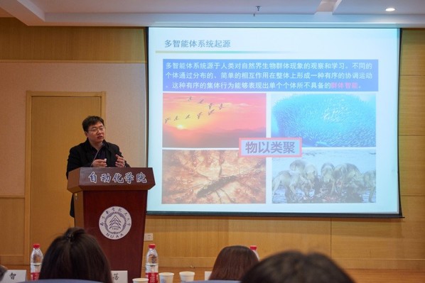 孙长银教授做了《多智能体深度强化学习方法》的大会报告,他重点介绍了学习机器的相关内容,并强调多智能体是具有一定自主协同能力的多个智能体组成,按一定规则协同作业,能够表现出较高智能行为的复杂系统,并研究了多智能体的任务建模、环境建模和人类行为建模,实现了多智能体系统的交互和协同控制。