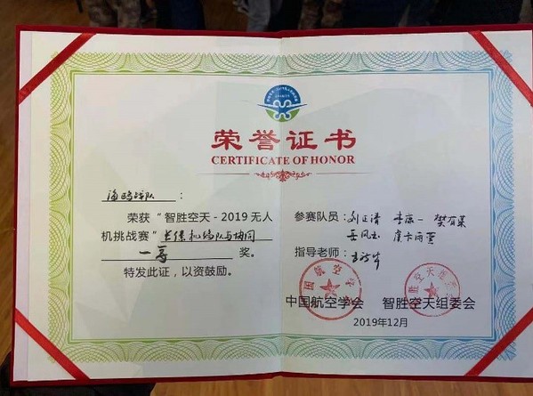 12月6日至8日,“智胜空天-2019”无人机挑战赛在陕西省咸阳市空军工程大学三原校区举行。beat365中国官方网站beat365中国官方网站派出了两只参赛队伍参与挑战,经过两天紧张激烈的角逐和多轮的比拼,由我院王新华老师指导,研究生刘正清、李康一、樊有容、王皓及本科生岳凤玉、虞卞雨萱组成的海鸥战队斩获本次大赛科目四(长僚机编队与协同)一等奖,研究生刘禹、王凯、马梓元、张志宏及本科生吴玲燕、张研组成的翔飞战队夺得科目一(无人机多目标识别)优胜奖,彰显了我校航空航天特色专业领域的优势和学子的风采。