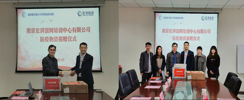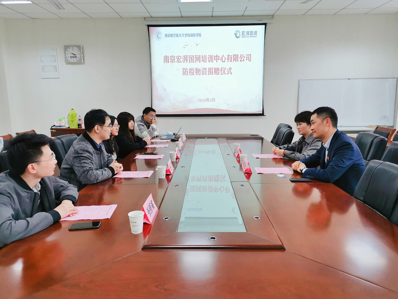 4月16日下午,南京宏湃国网培训中心有限公司防疫物资捐赠仪式在beat365中国官方网站1号楼405会议室举行。企业代表何广会、王略,以及我院党委副书记张跃、团委书记刘斐文和各年级辅导员出席此次仪式。
