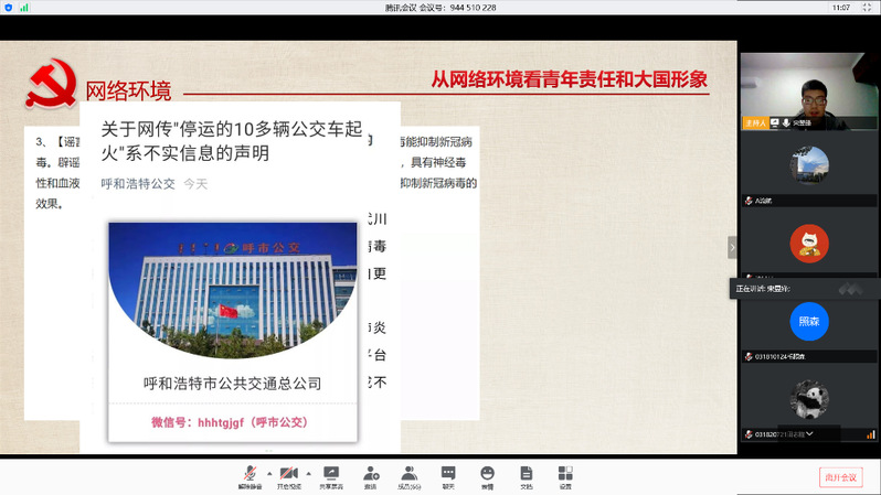 首先,宋昱锋同志从网络特点谈起,结合当下关于疫情的谣言实例,分析目前存在的问题。号召青年党员和青年学生增强知识储备、自觉抵制谣言、正确发表言论,面对国外网络上对于中国的不实攻击,更要理性判断,尊重文化差异,深刻认识中国在世界舞台的大国形象和大国担当。同时也鼓励参与本次交流活动的同志们肩负起当代青年应有的担当,树立“四个自信”,牢记使命,砥砺前行。