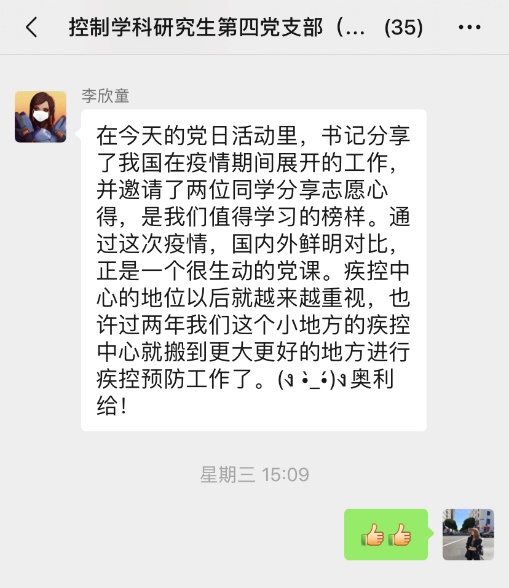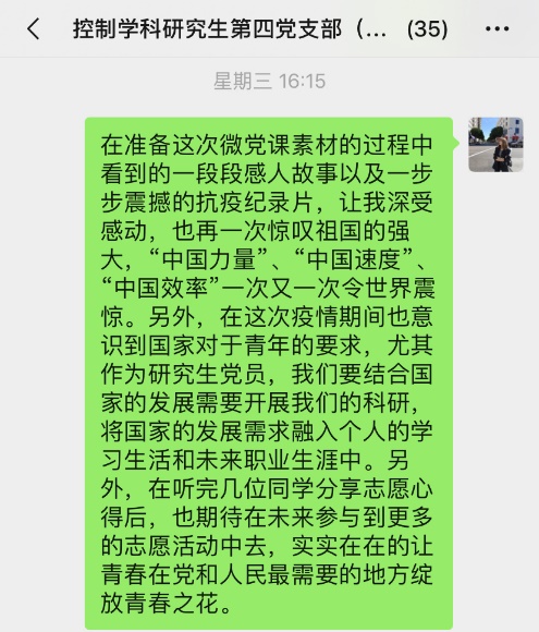为贯彻中共中央《关于加强党的领导、为打赢疫情防控阻击战提供坚强政治保证的通知》和《新时代爱国主义教育实施纲要》精神,带动学生党员认真学习新冠肺炎疫情防控“大课”,发挥党员先锋模范作用,2020年4月22日下午,beat365中国官方网站控制学科研究生第四党支部开展了一场以“战‘疫’下的中国,奋斗中的你我”为主题的线上党日活动,支部党员、发展对象、积极分子共计41人参加了本次活动。该党支部由学院教职工张玲老师担任支部书记,本次活动参与人员均为导航研究中心研究生。