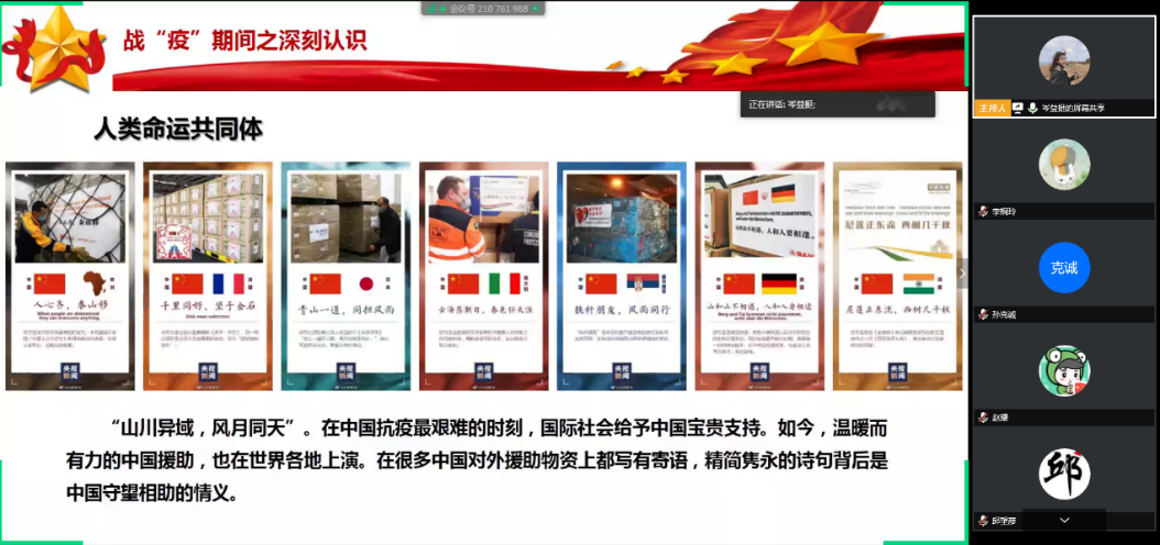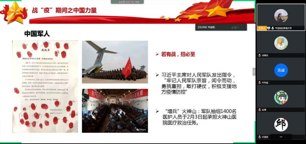 岑益挺同志首先介绍了新冠疫情爆发后逆行驰援武汉的医护人员和军人们的英勇事迹,体现了中国人“一方有难、八方支援”守望相助精神以及“驰援武汉”的“中国速度”。