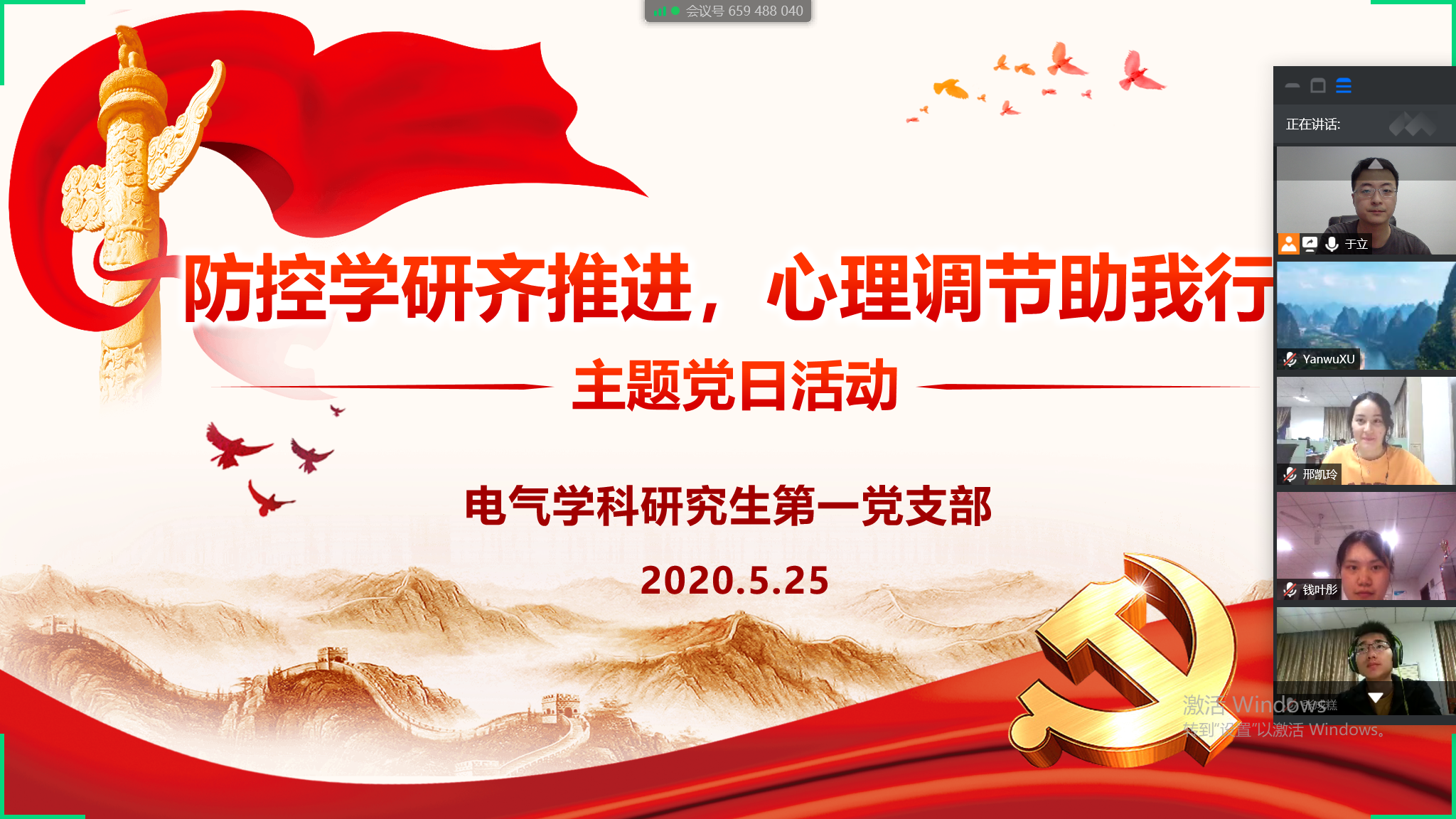 全国两会的顺利召开,展示了党中央、国务院统筹抓好疫情防控和经济社会发展的坚强决心,极大鼓舞了全国上下团结一致、共克时艰的信心和勇气。beat365中国官方网站电气学科研究生第一党支部全体师生热切关注全国两会的召开,结合研究生自身疫情防控与研学生活中的心理调控方式方法,5月25日,第一党支部开展了一场以“防控学研齐推进,心理调节助我行”为主题的线上党日活动。支部党员、发展对象、积极分子共计28人参加了本次活动。