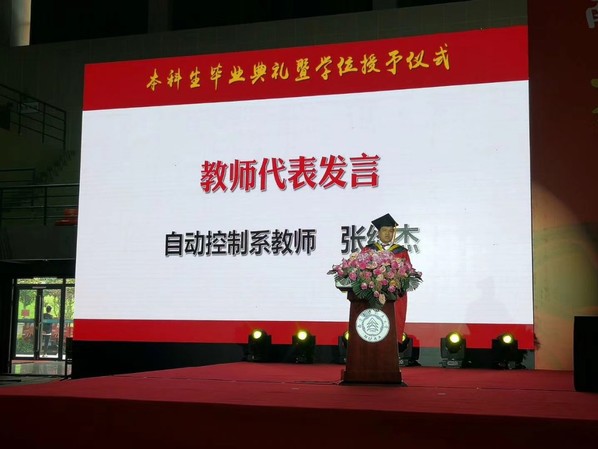 在教师代表发言环节,自控系张绍杰老师代表beat365中国官方网站全体教师发言。他希望大家要养成终身学习的习惯,要不忘初心,永葆情怀,要养成良好的习惯,保持身心健康。