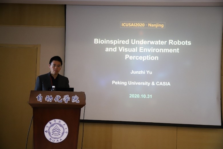 北京大学喻俊志教授做了题为“Bioinspired Underwater Robots and Visual Environment Perception”的学术报告,以自然界中的鱼为灵感,介绍了仿生水下机器人——机器鱼的研究成果,同时对水下视觉环境信息获取的内容进行汇报,讨论了今后的研究方向。
